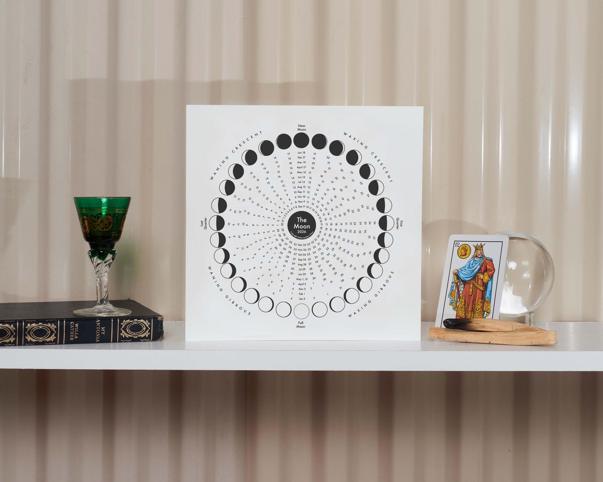 My first lunar calendar! I tried to make this as innovative and simple as possible, and trust me, it was not easy. I put the emphasis on the moon's phases and applied the dates accordingly. It's wonderful what emerged: A spiraling galaxy of dates amongst the orderly laws of physics.